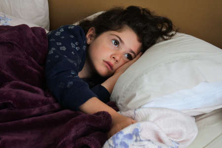 the girl just woke up, fresh beautiful morning face of a child in the bedroom