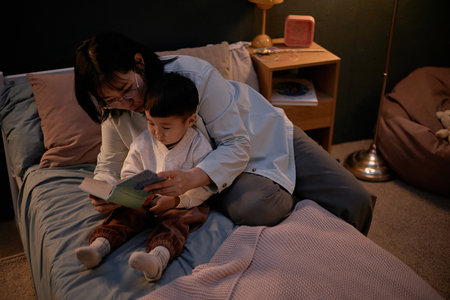 Asian middle aged woman sitting on bed reading book to Asian child, both focused on pages, spending evening together at home, mother and son bonding during bedtime routine