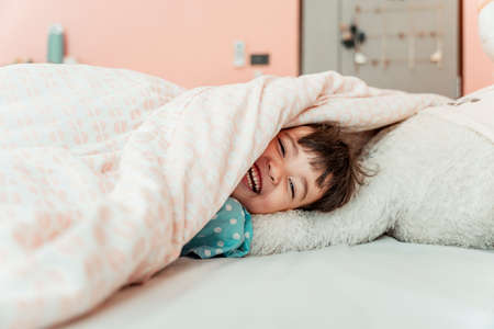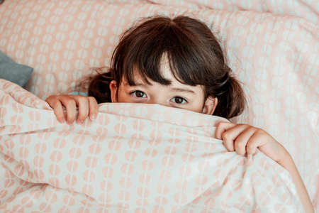 Cute little girl lying under blanket in her bed with happy face. Evening night time.