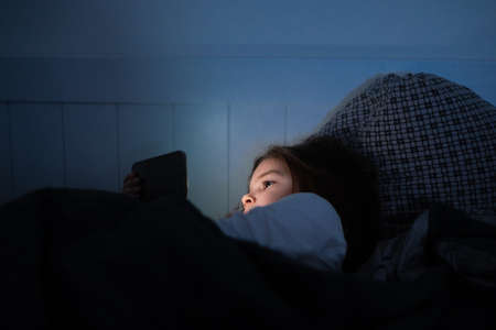 Baby girl is watching video on smartphone in bed before sleeping at evening
