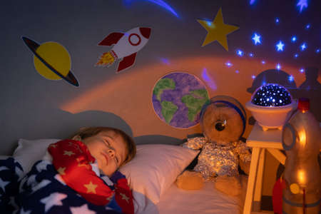 Happy child sleeping with toy rocket and teddy bear. Kid pretend to be astronaut. Imagination and children dream concept