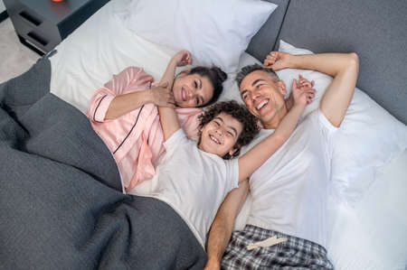 Off to dreamland together. Shot of a young family sleeping beside each other.