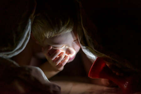 Happy Family Mom and little son reading book with flashlight under the blanket.