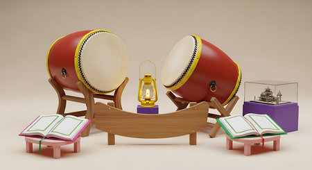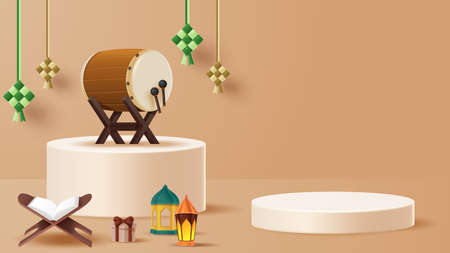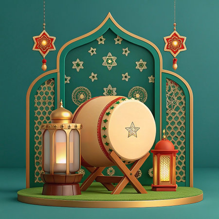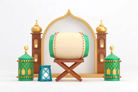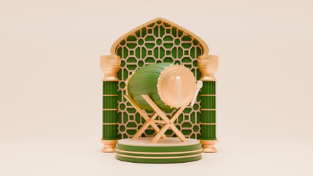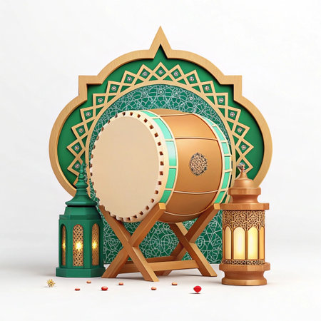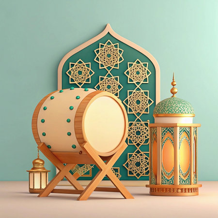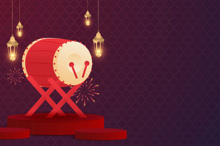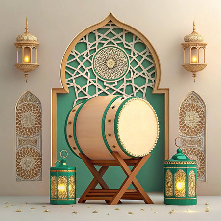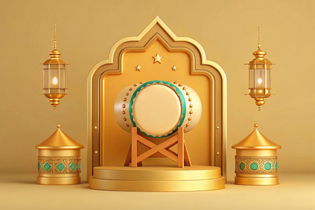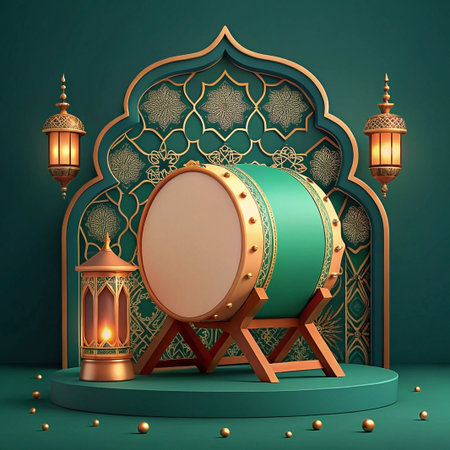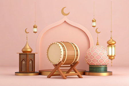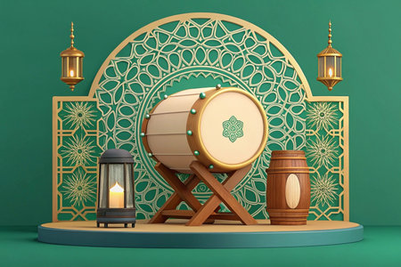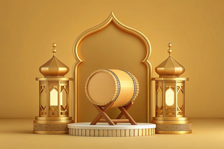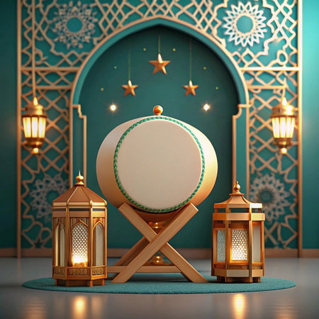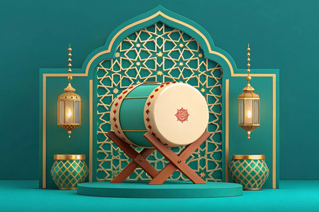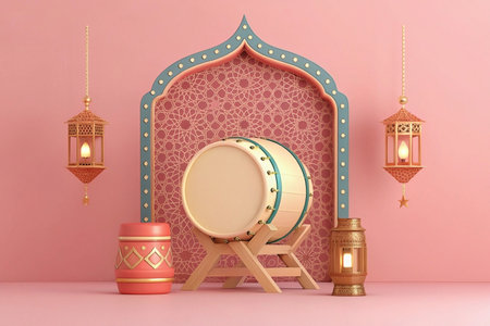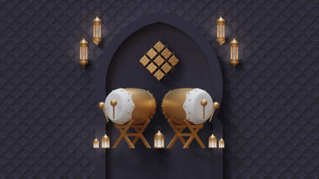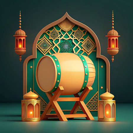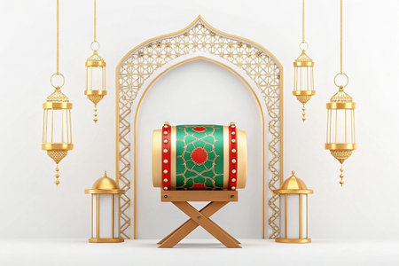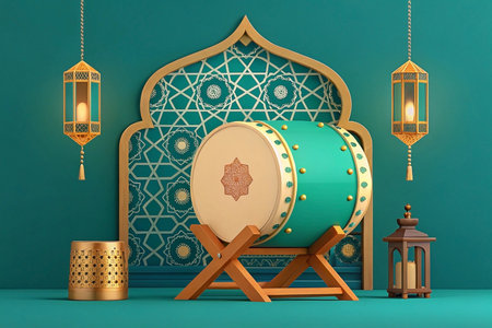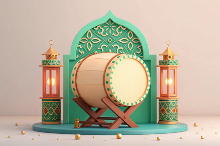 3D render of Bedug drum with lanterns and Islamic arch for Ramadan.