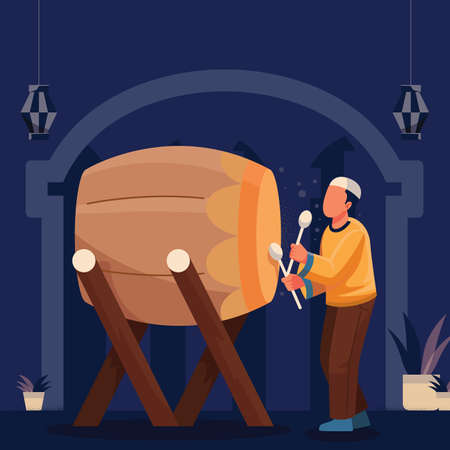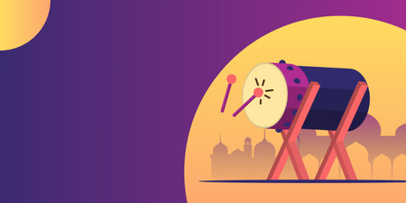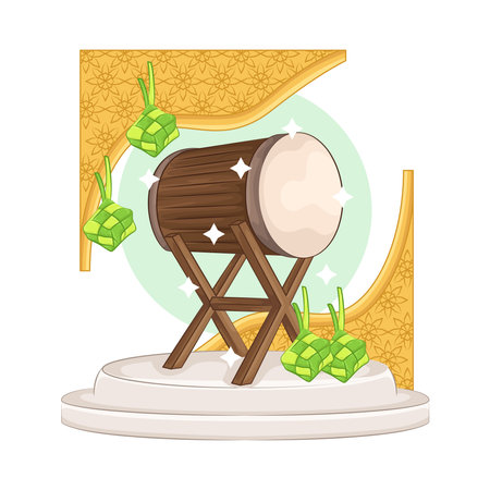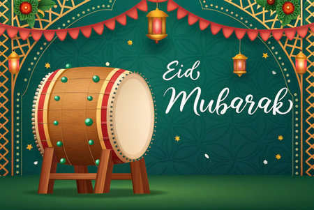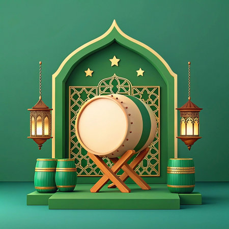 Bedug drum with lanterns and Islamic arch on green background.
