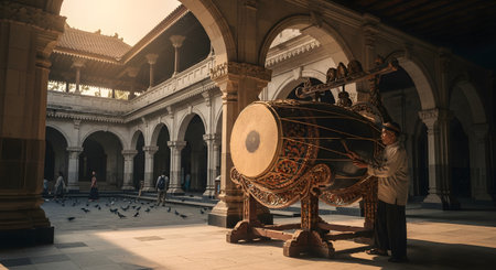 Bedug drum with ornate Islamic arch and lanterns.