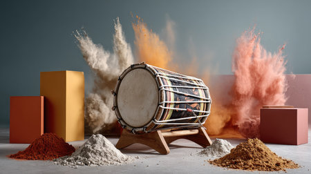 A traditional drum rests on a wooden stool in the foreground of a rural scene, with orange and blue flags strung across the background. the setting conveys a sense of cultural heritage and musical tradition, evoking a festive atmosphere. Generative AI