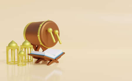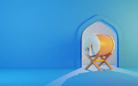 Ramadan Background with bedug drum, blue background, copy space text area, 3D illustration