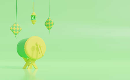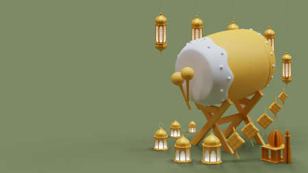 Ramadan Background with bedug drum, glass lantern, green background, copy space text area, 3D illustration