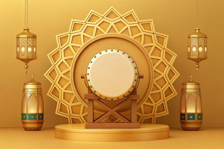 Golden Ramadan drum on pedestal with ornate lanterns.