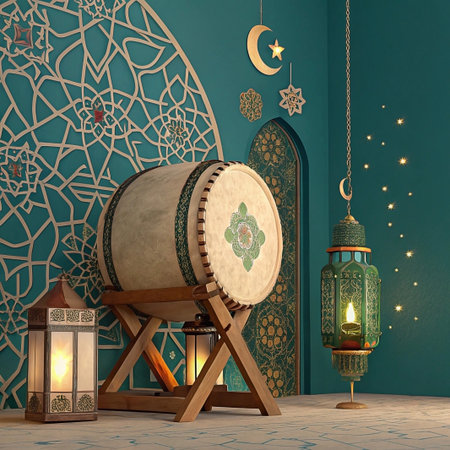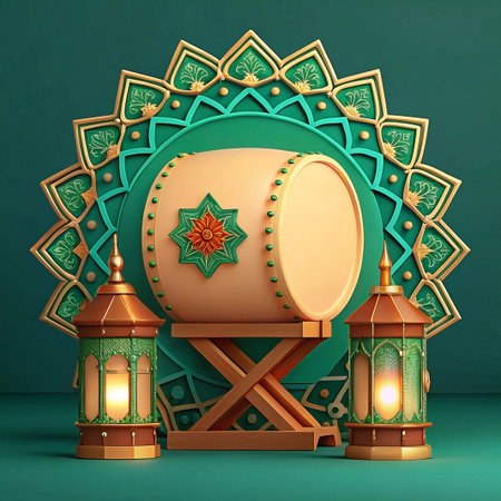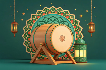 Ramadan Bedug drum with gold lanterns and mandala on teal background.