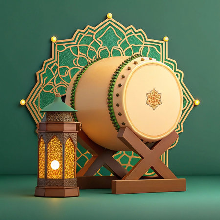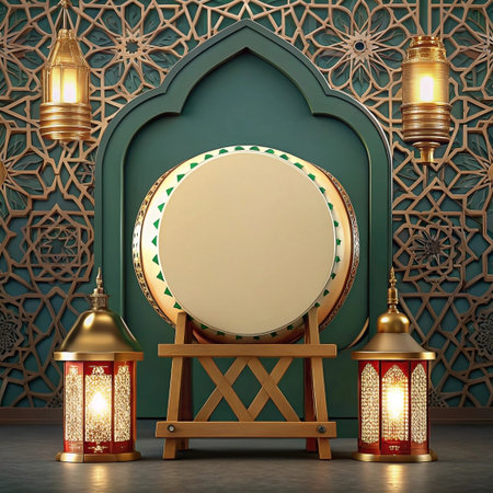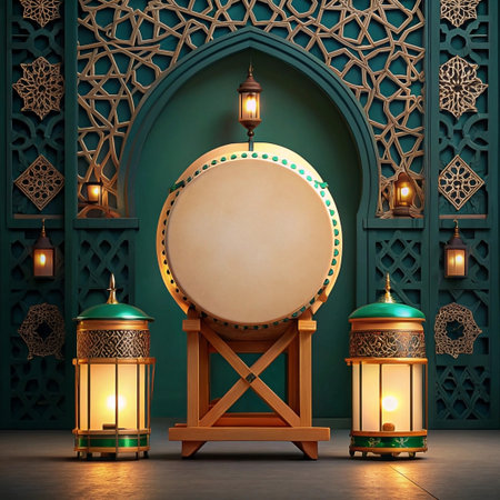 Ramadan drum with lanterns in ornate Islamic setting.