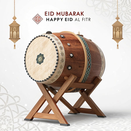 Ramadan drum with lanterns and Islamic patterned backdrop.
