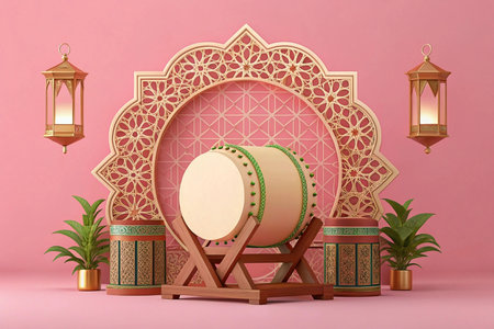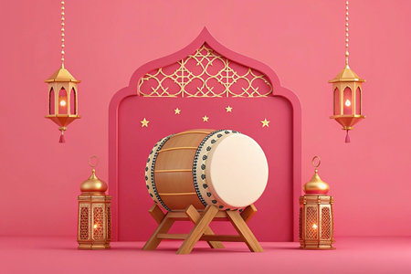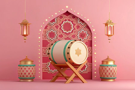 Bedug drum with Islamic lanterns and geometric patterns on pink background.