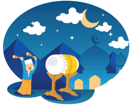 Cute boy with bedug drum cartoon vector illustration. Ramadan cartoon mascot vector illustration.