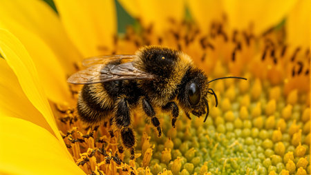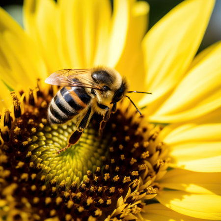 In a close-up view, a honeybee flits among the petals of a radiant sunflower, gathering golden pollen under the warm sun, showing nature's intricate details and beauty.