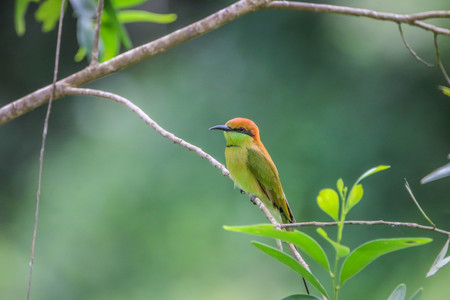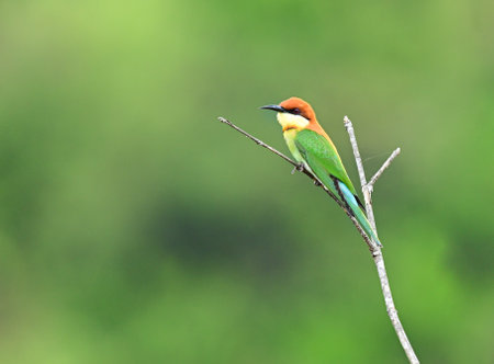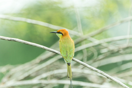 Green Bee-Eater perching on perch looking into a distance with blur green background