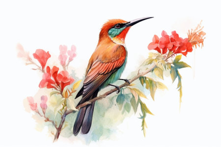 A vibrant bee-eater bird is perched on a delicate branch adorned with small red flowers. Its plumage displays a spectrum of colors, including green, yellow, orange, and blue. The blurred background features rich red and purple tones. This image is suitable for various commercial uses, including advertising and editorial content.