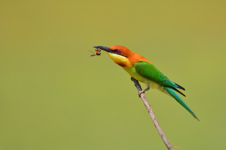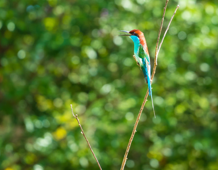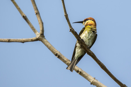 Image of bird on the branch on sky background. Wild Animals. Chestnut-headed Bee-eater (Merops leschenaulti)