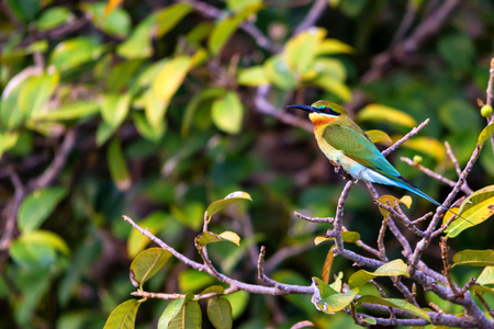 The blue-tailed bee-eater (Merops philippinus) perching on branch with leaves, colorful bird on clear background, Yala National Park, Sri Lanka, exotic birdwatching in Asia,bird in natural environment