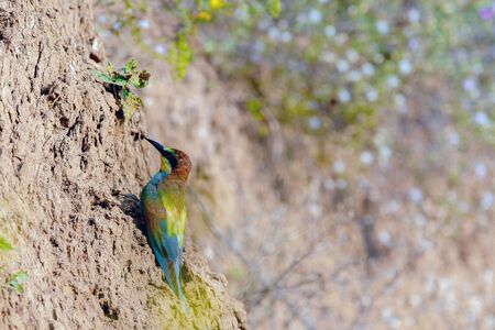 European Bee-eater or Merops apiaster on ground near hole nest.