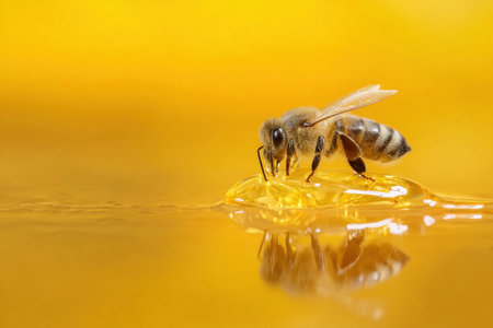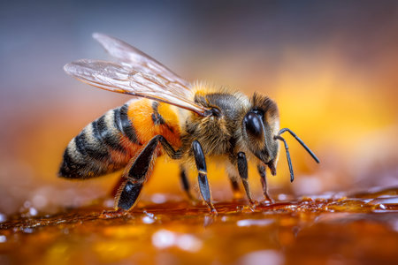 A close-up captures a honey bee gathering nectar, its tiny legs and delicate wings contrasting against a warm, shimmering surface under lively sunlight.