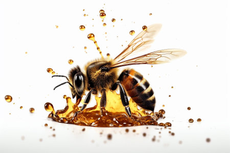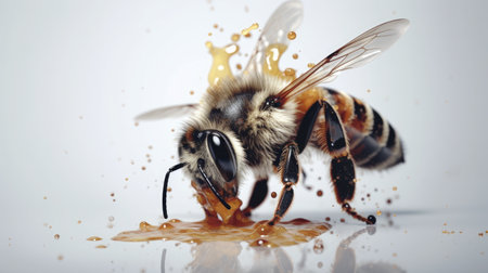 An illustration of a bee on a white background with drips of honey, emphasizing the importance of bees in pollination and honey production. Ai generated