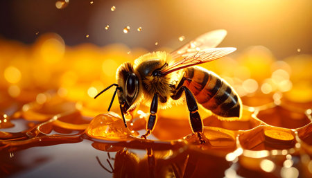 A bee perches on a shiny droplet of honey, reflecting golden hues in sunlight.
