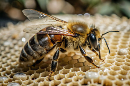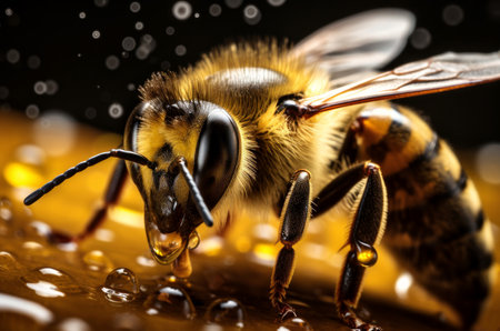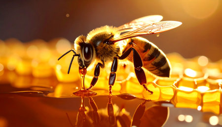 In a warm, golden glow, a diligent honey bee takes a moment to sip sweet, glistening nectar directly from the honeycomb. This macro photograph captures the intricate details of the bee and the rich, liquid gold it produces, symbolizing hard work, natures sweetness, and the vital process of honey creation.