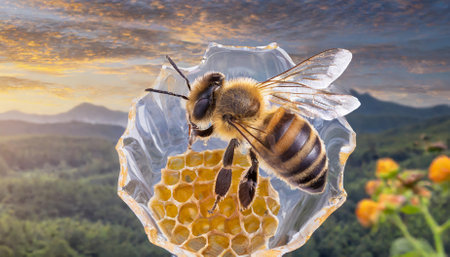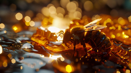 In a mesmerizing macro view, a single honey bee diligently works atop a glistening honeycomb. Bathed in the warm, golden glow of a setting sun, every detail from its delicate wings to the rich, viscous honey is highlighted, capturing a moment of natural industry and the sweet essence of natures bounty.