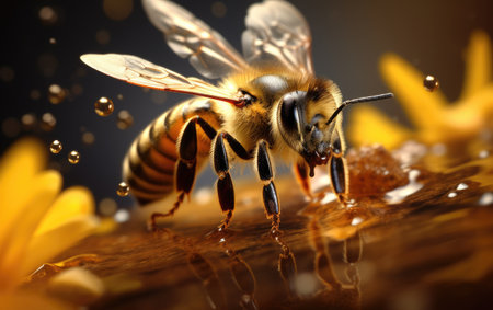 Busy honey bee picking up pollen from a yellow flower generated by artificial intelligence