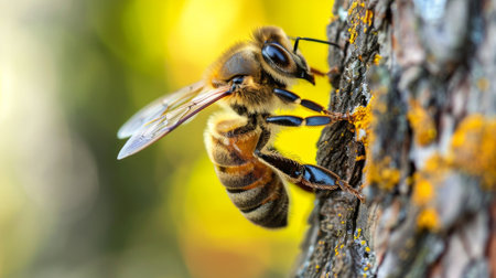 A bee gathering resin from a tree trunk, showcasing the multifaceted roles of bees in ecosystems.