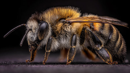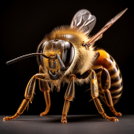 A striking close-up of a honey bee showcasing its intricate details, from its delicate wings to its fuzzy body, illustrating the beauty of this essential pollinator.