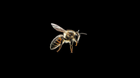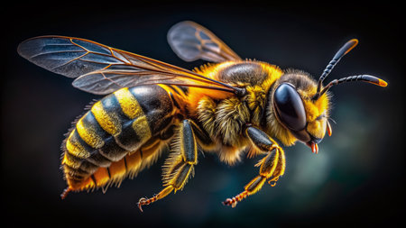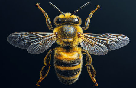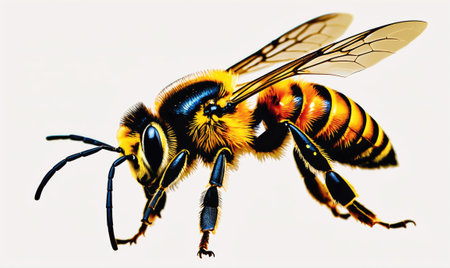 A honey bee is depicted in vivid detail, concentrating on its vibrant yellow and black striped body and delicate wings, highlighting its role in pollination within natural ecosystems.