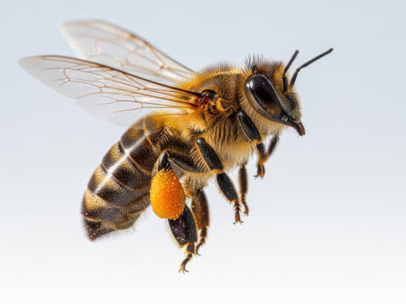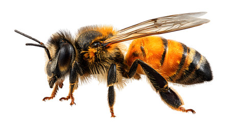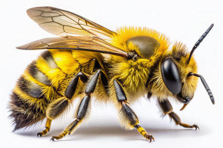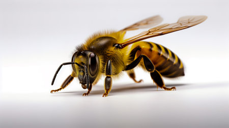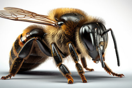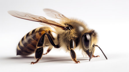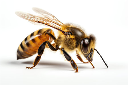 This detailed close-up image features a honeybee, showcasing intricate anatomy and structure. The white background highlights the importance of bees in nature and ecosystem.