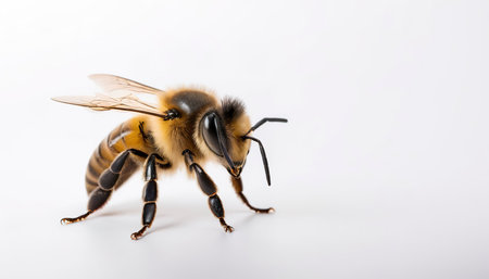 Isolated bee close-up with detailed wings and fur. High-resolution insect against a white background. Concept of bee anatomy, wildlife, and educational content. Banner. Copy space