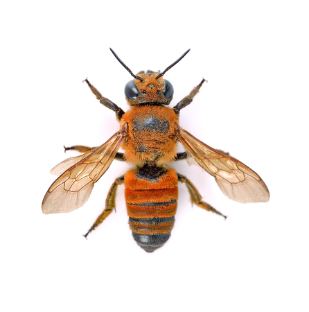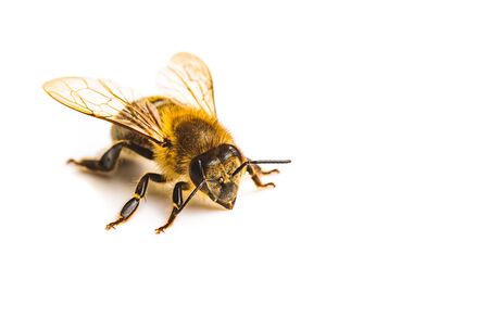 Bee isolated on white background. Macro image of bee. Apis mellifera