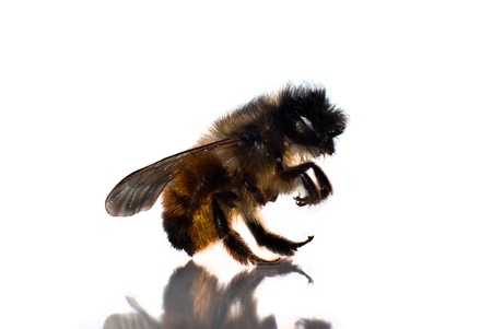 Bee on extermination, dead on the ground. Dead fallen bee on white background, conceptual image on pesticides and environmental risk.