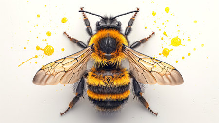 Detailed bee illustration against an abstract paint background. Realistic bee in an artistic composition. Concept of conservation, creativity in nature, and pollinator importance. Digital art