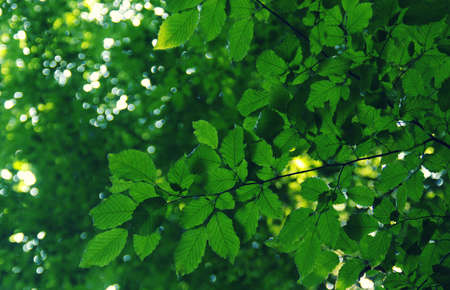 Natural forest background. A twig with green leaves lit by the rays of the sun on a green blurry background.