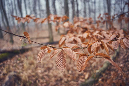 Beech tree branch with mist in the background