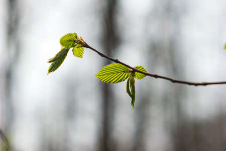 Young hazel tree branch sprout with new growing leaves in spring forest