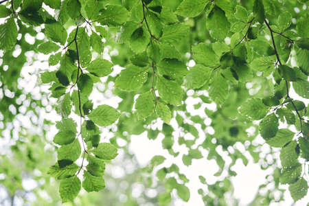 Bright green hornbeam tree leaves in front of the sky. Forest nature background.