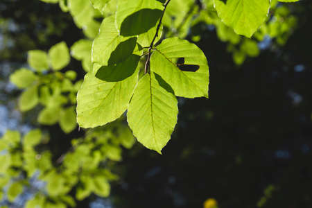 Spring in the arboretum, fresh leaves illuminated from behind, close-up, fuzzy background