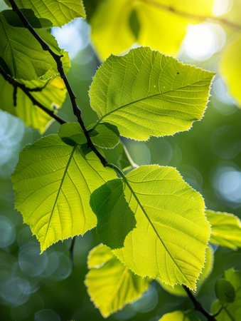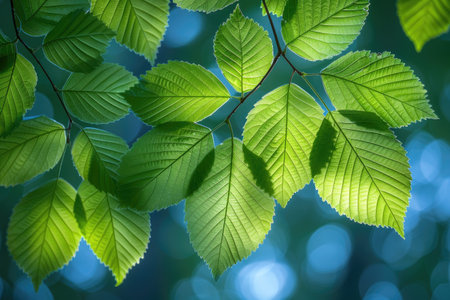 Close-up capturing sunlit green beech leaves hanging from branches, exhibiting their intricate vein patterns and serrated edges. A blurred bokeh background enhances the depth and focus.