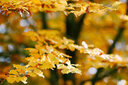 Close up of bright vibrant yellow leaves on a tree branches in autumn park. Detail of fall forest foliage.