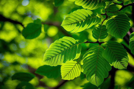 Sunlight filters through vibrant green leaves, highlighting their intricate veins and the lush life force of nature's canopy