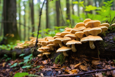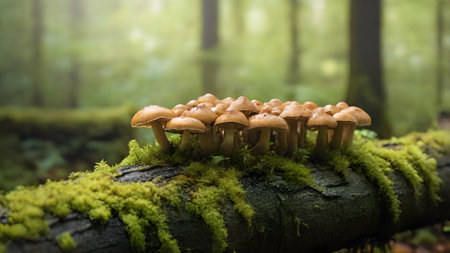 mushroom clusters on a log in a dense forest, created with generative ai