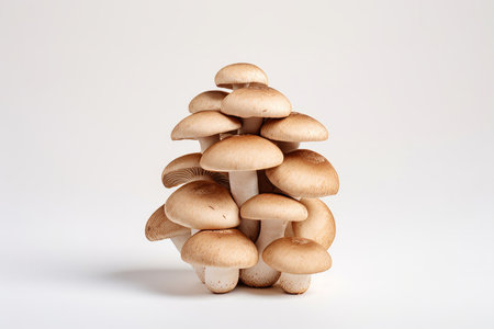 A neat cluster of shiitake mushrooms standing upright on a white background, with their unique caps creating an interesting visual contrast.