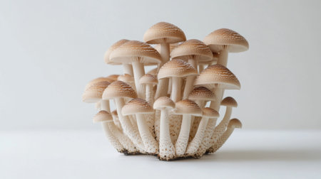 A cluster of Shimeji mushrooms arranged artistically on a pristine white surface, creating a balanced and aesthetically pleasing layout.